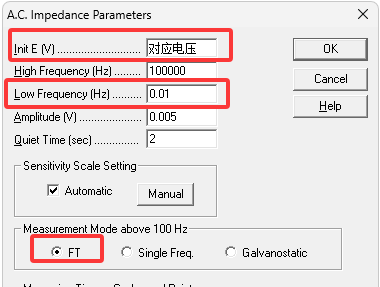 选取A.C Impedance模式,按照下图输入数据,点击”ok”,测试完毕后,保存数据即可。