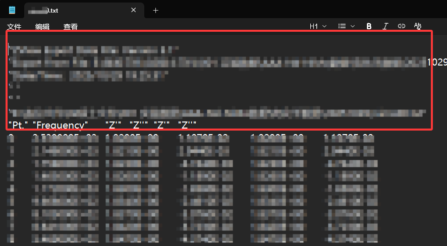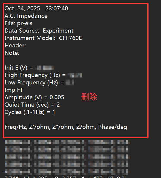 首先打开电化学工作站保存的txt文件,删除部分无用文本,保存。