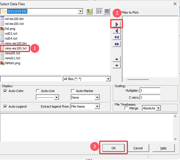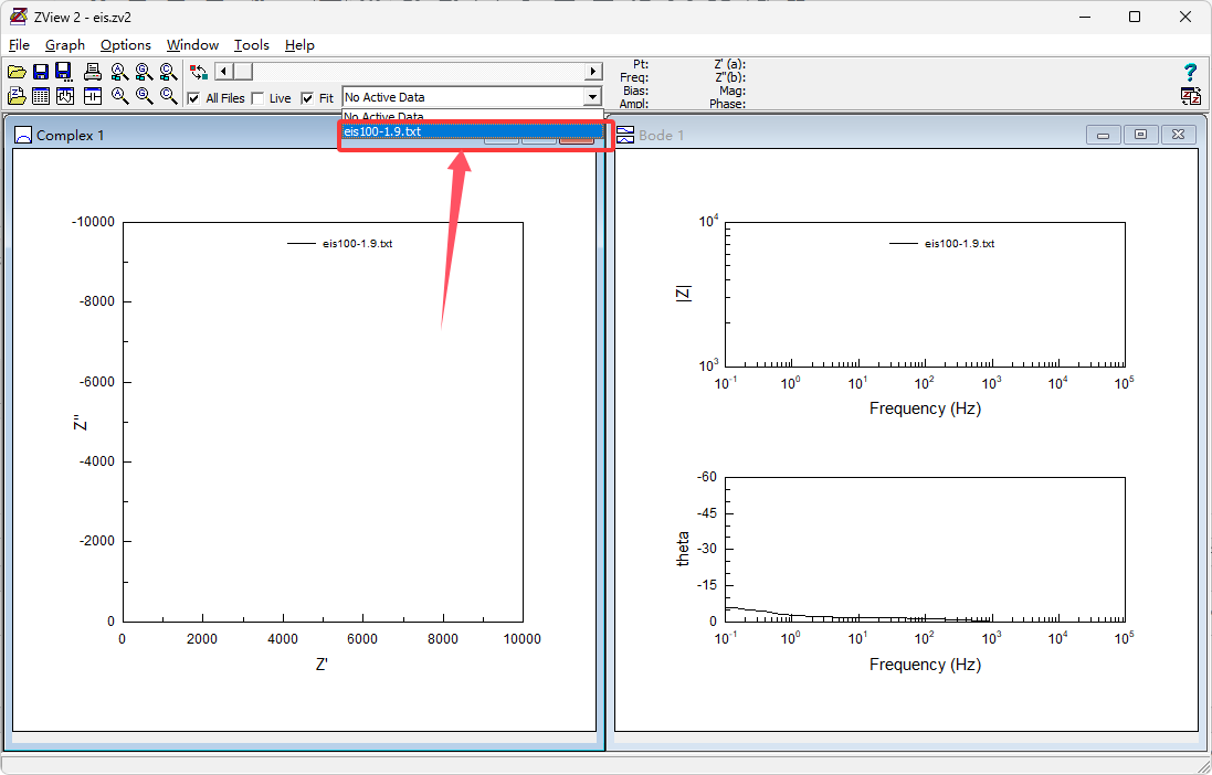之后打开Zview2软件,点击File-Data Files…,在弹出的对话框中,选择你处理过的txt文件,点击右边箭头,之后点击右下角ok按钮