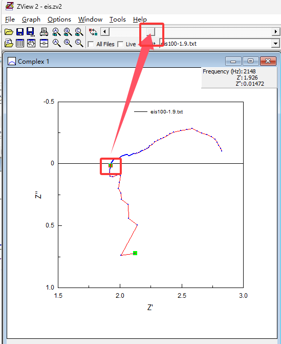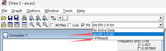 之后如下图所示,选择文件,然后在左边的Complex1窗口右击,点击Autoscale即可放大数据。在界面内,按住鼠标进行拖动,会出现一个框,松开鼠标左键,就会放大对应区域。类似电化学工作站的放大功能。