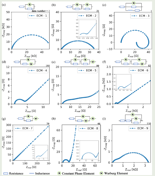 之后我们要根据自己的EIS曲线形状,挑选适合自己材料的模拟电路图,请参考下图,图片来源文献:Electrochimica Acta 418 (2022) 140350