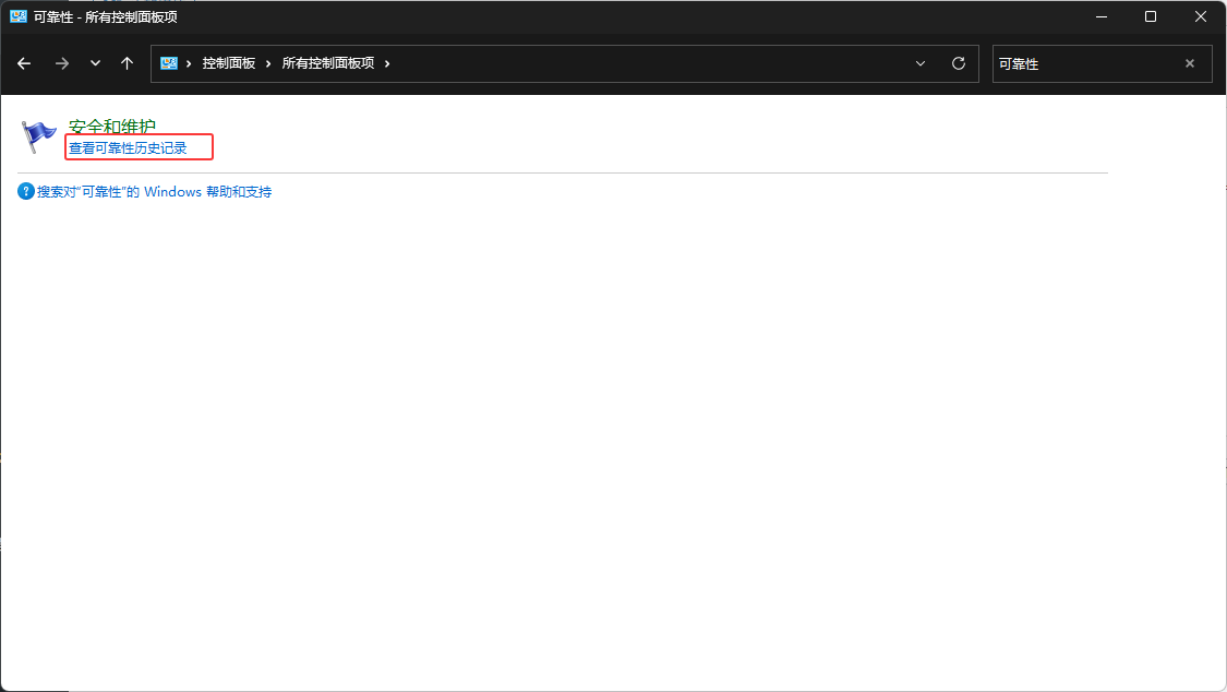 事实上,这是文件管理器卡死,而桌面黑屏闪烁,是文件管理器重启导致的。我们需要首先定位是为何出现这种问题,在win搜索栏搜索“控制面板”,之后在控制面板中,搜索“可靠性”,点击“可靠性历史记录”
