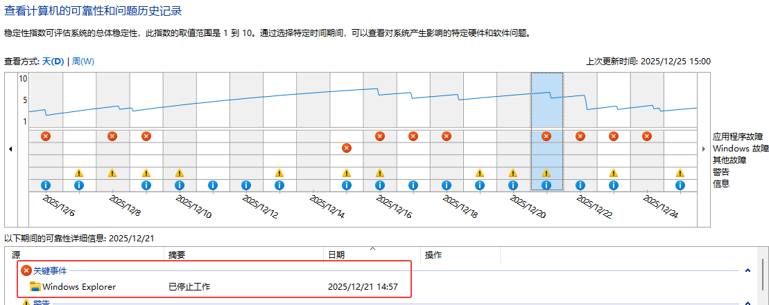 选择带有红色X的记录,关键事件中应有”Windows explorer 已停止工作”,双击这个关键事件