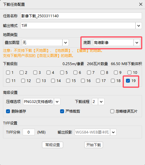 6.右键区域,点击数据下载-选择面,点击刚刚框选的区域后,在弹窗中,点击高级设置,底图选择高德影像,下载级别选择能选择的最高等级,其他等级一律不选。注意,下载完后,有可能发现图片是一片绿色,那么说明你所在的区域并没有这么高级别的卫星图片,你需要降低下载级别,重新下载。一般来说,在你选择下载级别后,看看是多少M/像素,如图0.255m/像素就是不能用的,需要选择到18级才可以正常使用。