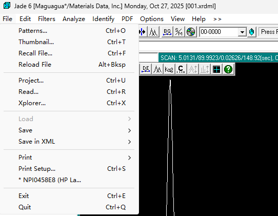 之后对我们的材料XRD数据导出,在Jade主界面,点击File – Save – Premary pattern as *.txt