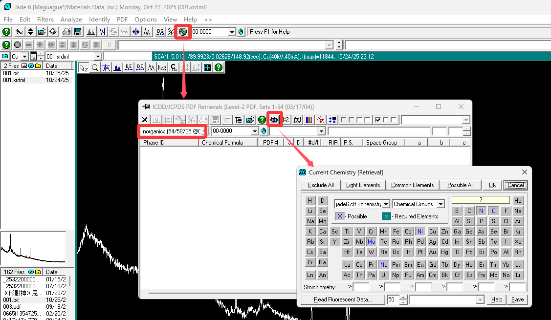 之后需要对你的化合物进行对应峰位的寻找。点击光碟样图案、在弹出的窗口中选取对应的库,例如我选用”Inorganics”库