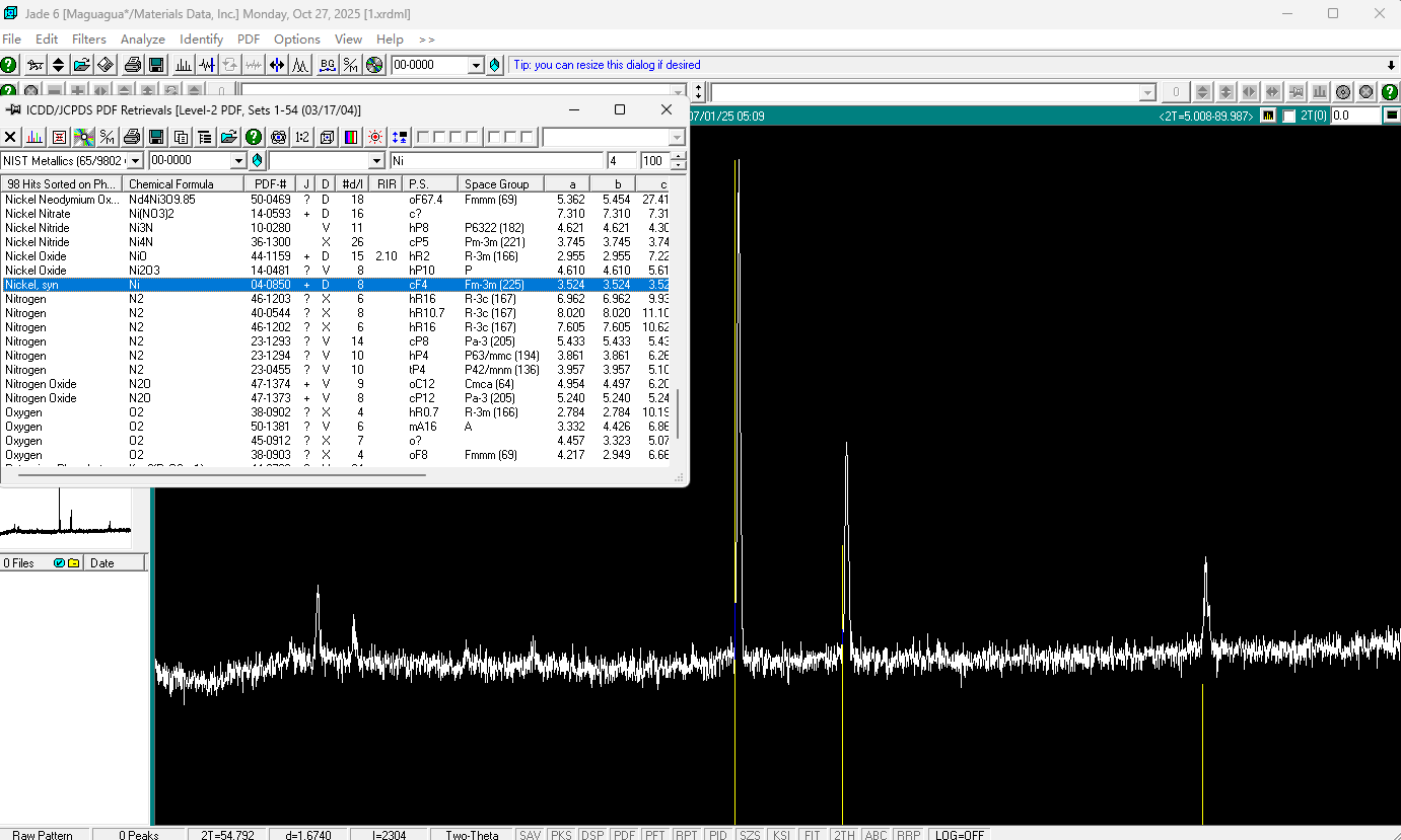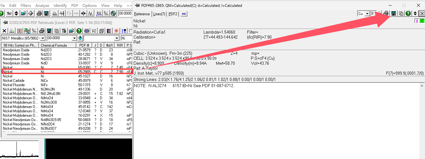 之后在弹出的对话框中、寻找与你的xrd数据吻合较好的图谱,如图所示,该材料的三个峰均对应了Ni的峰。